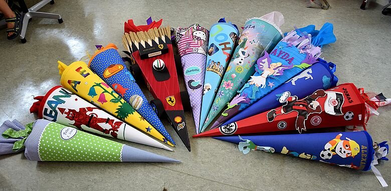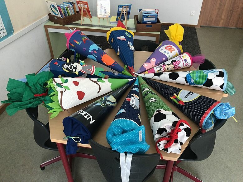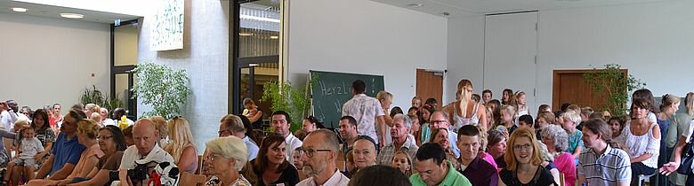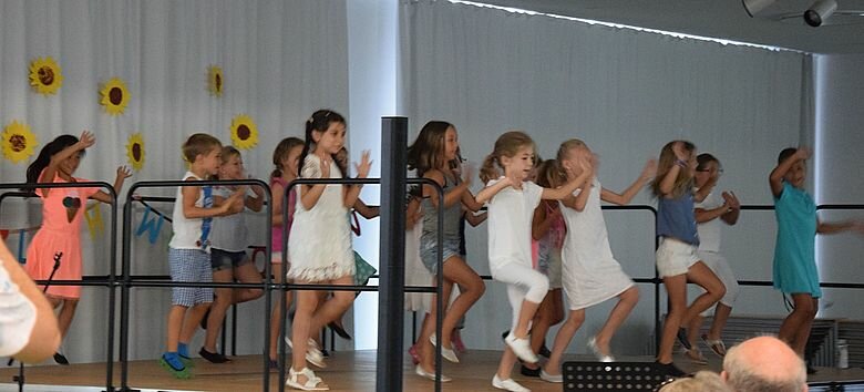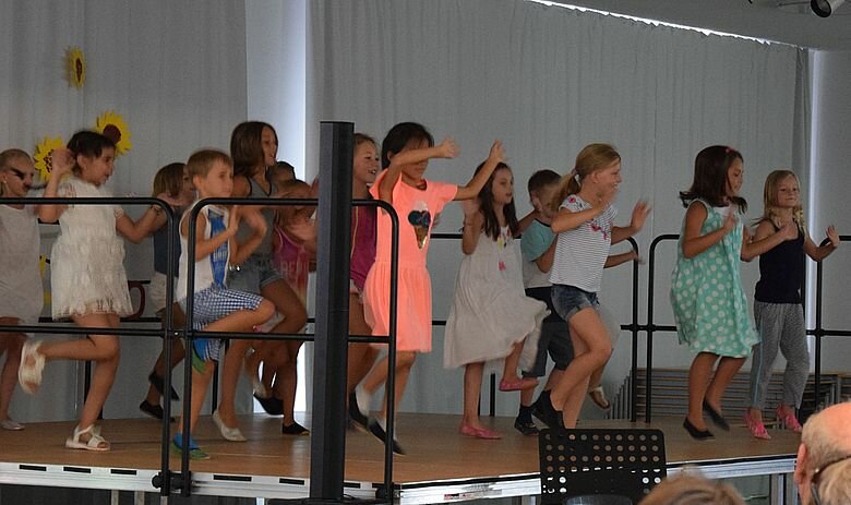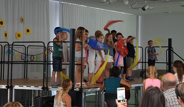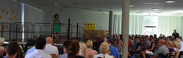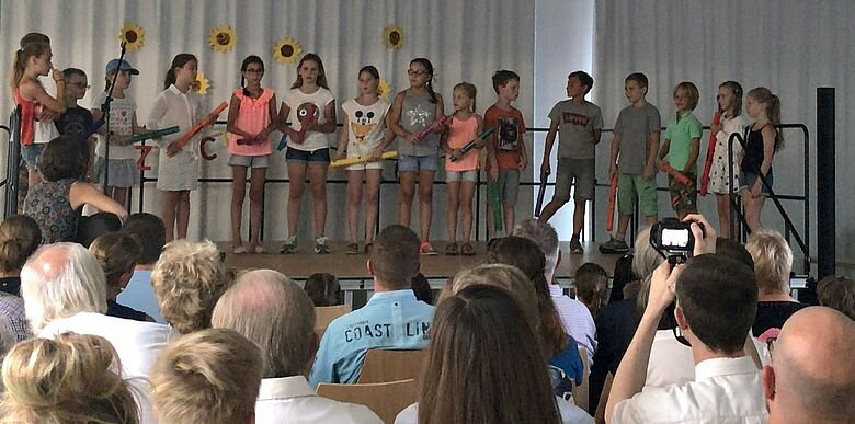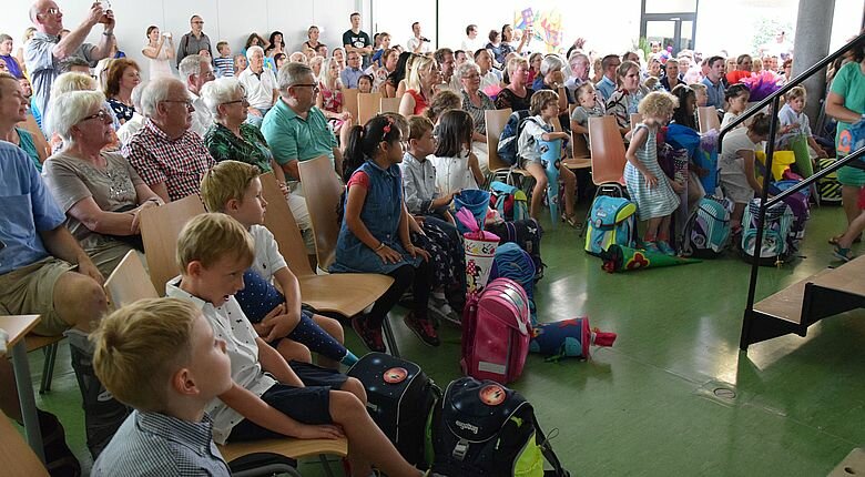 Zur Einschulungsfeier unserer Schulanfänger kamen am Dienstag Eltern, Verwandte und Bekannte. Nach den Begrüßungsworten der Schulleiterin Frau Werner, wurden bei hochsommerlichen Temperaturen und vollem Haus, die Neustarter mit zwei tollen Liedern und einem mitreißenden Tanz in die Schulgemeinde aufgenommen. Erwartungsvoll saßen die Kinder, bepackt mit Ranzen und Schultüte, auf ihren Stühlen, bis sie von ihren Paten auf die Bühne gerufen wurden. Dann ging es endlich in den entsprechenden Klassenraum.