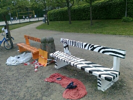 Unsere Bänke sind mitten in Ober-Erlenbach neben der Taunussparkasse, super. Noch vor Ostern grundierte eine kleine Gruppe die Bänke mit weißer Farbe, sodaß der kommende Regen den Bänken nichts mehr anhaben konnte. Im April trafen wir uns dann in der Schule, und erarbeiteten das Thema für die Bänke, es sollte ja nicht so schwierig sein. Nach einer Idee einer Nachbarin, auf die weißen Bänke schwarze Flecken zu malen, und fertig wäre eine Kuh. Das fanden die Kinder langweilig, und so suchten wir nach anderen Tieren mit verschieden Mustern, denn Tiere fanden alle gut. Eifrig wurde im Internet recherchiert, und dann abgestimmt, mit dem Ergebnis: Gepard, Tiger und Zebra!! Wir losten den Tieren eine Bank und eine Gruppe Kinder zu, sodaß wir in kleinen Gruppen zu Ziel kommen wollten. Mit der Stadt Bad Homburg standen wir in regem Kontakt, wie ist der Stand der Dinge ist. Außerdem mußten wir am 29.05.2012 fertig sein, dann würden die Damen und Herren herumfahren und entscheiden, wer gewonnen hat.